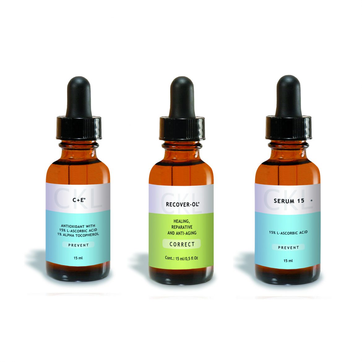 Serum 15 pertenecen a la línea de prevención y tienen una concentración de L-Ácido Ascórbico (vitamina C) de un 15% que es la formulación exacta para entregar reales beneficios a la piel, es apto para pieles normales a grasas y ayuda disminuir la apariencia de líneas finas, mientras que C+E es una combinación de ambas vitaminas que previene arrugas y es perfecta para pieles secas y maduras. Para corregir existe Recover-Ol que contiene Retinol y para estimular la piel, está Peptivel Q, que contiene péptidos. La presentación en suero de Cell Skin Lab permite una óptima penetración hasta la dermis, donde ejerce su verdadera acción.