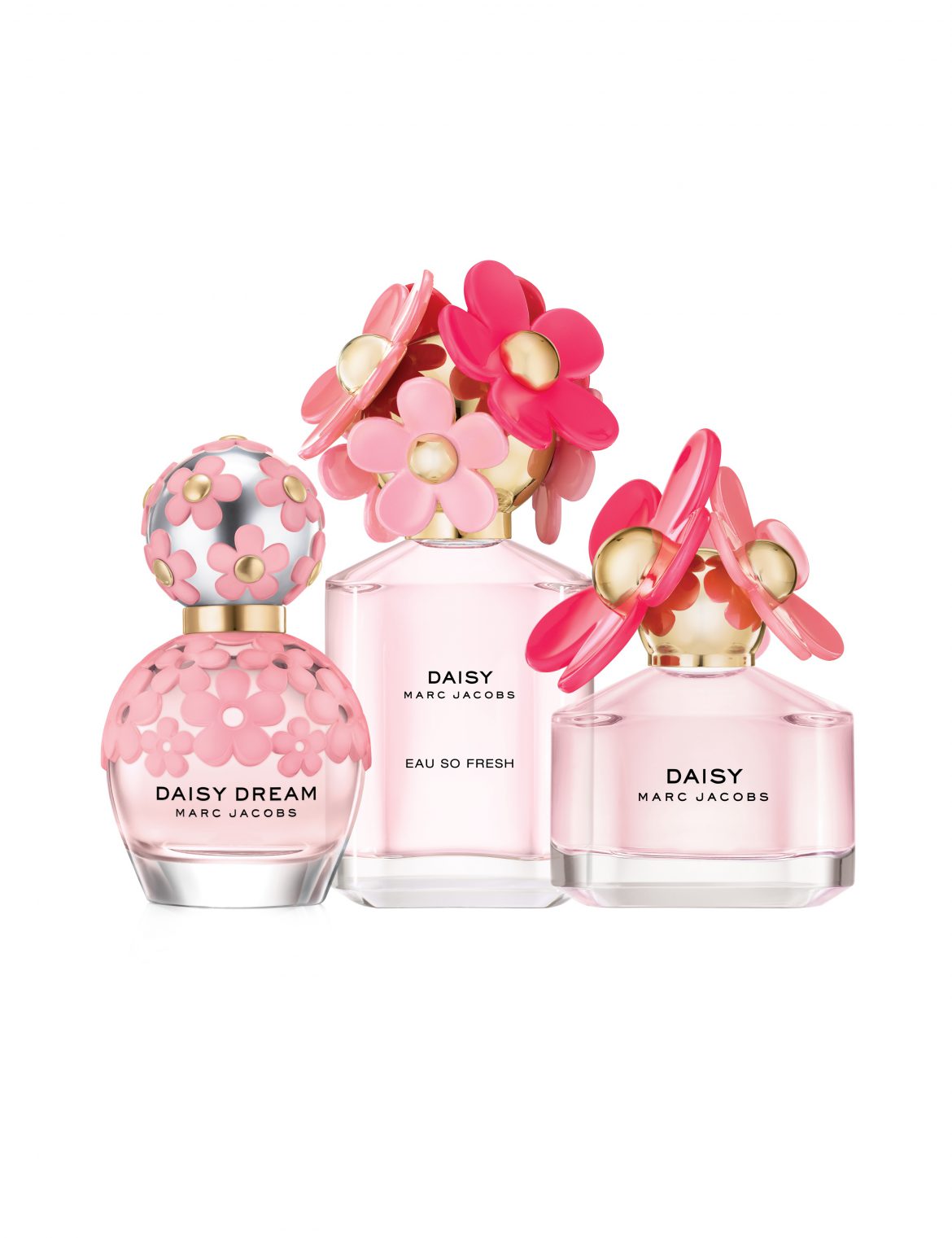 El packing de la colección, el cual fue diseñado por Marc Jacobs en colaboración con Coty, se presenta en un diseño que mezcla margaritas florecidas: desde las tapas de Daisy y las Ediciones de Eau So Fresh, donde destacan los tonos fucsia brillante y pétalos color rosa suave, hasta las ediciones de Daisy Dream, inundados en un rosado delicado con pétalos satinados. Por último, la fragancia rosa suave ilumina los frascos.